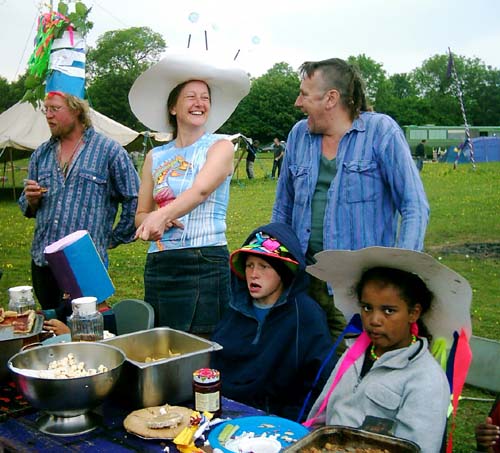 Pilton: Sunday 13 June 2004, on site at Worthy Farm. This time next week i'll be at Stonehenge . Yesterday we packed up at Rainbow Circle ,then I drove the kids bus here and unpacked it. Exhausting. But a fabtastic camp. Shame I was too busy to write about what happened. Today I cycled to Glastonbury Tor for the start of the walk to Stonehenge. Then back here, Exhausting.